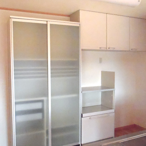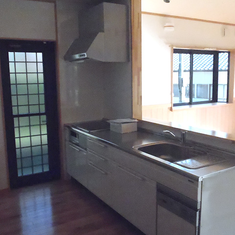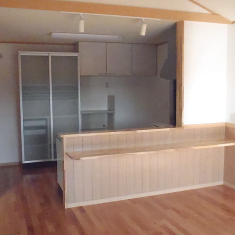 キッチンはIHクッキングヒーターでスペースも十分に確保しています。リビングダイニングの腰壁には板張りを採用しています。