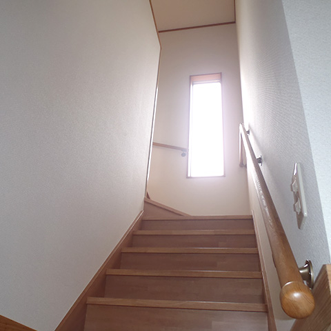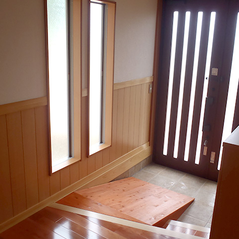 施主様の要望により、取り外し可能なスロープを設置しました。階段に明かり取りを設けています。リビングとダイニングキッチンは1間の開口があるので広く感じます。