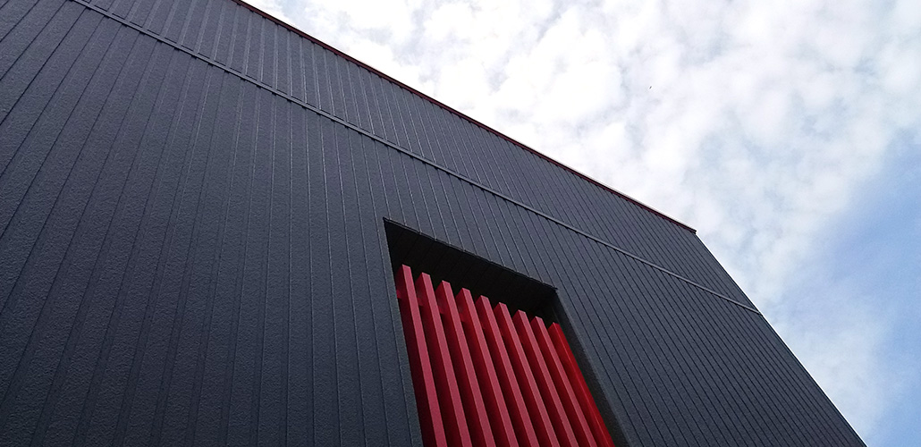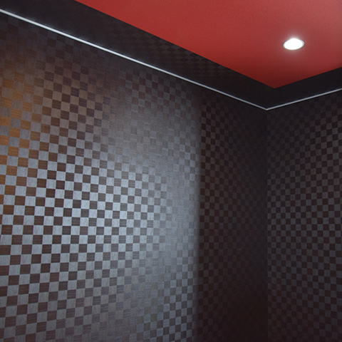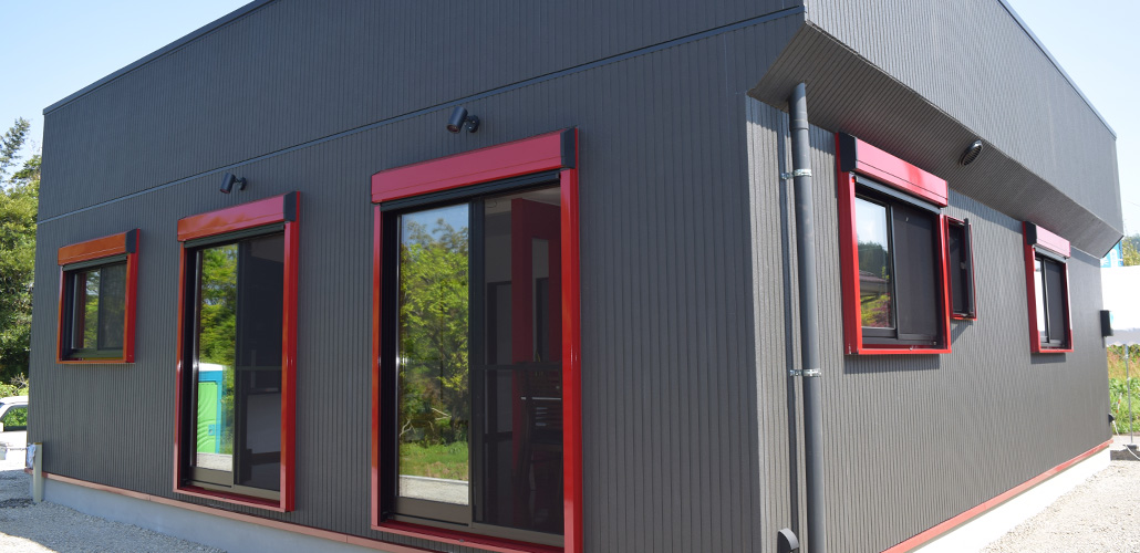 平屋のBox House。外観は黒を基調とし、ポイントに赤を使いまとまりのあるモダンな雰囲気に仕上がりました。玄関ポーチはしっかり光を取り入れられ、スタイリッシュな仕上がりになっています。