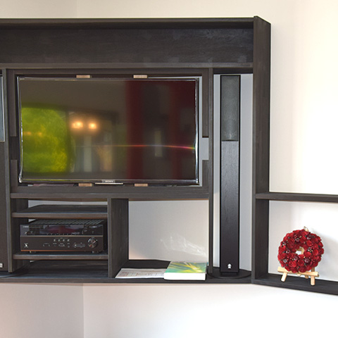 内観はインパクトのある赤の飾り棚付き壁。そして御施主様の御希望の壁掛けタイプの造作テレビ台も設置。ご満足頂ける家となりました。