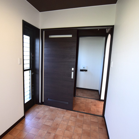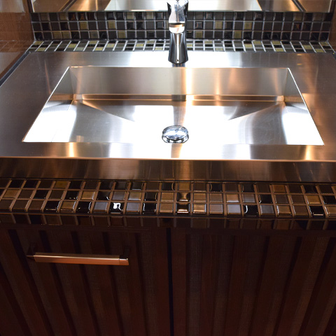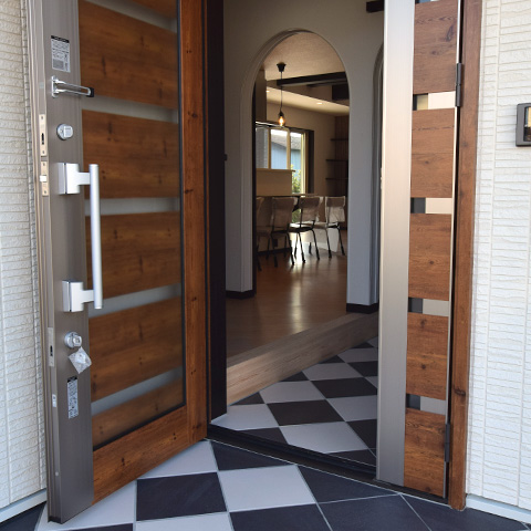 造作の洗面化粧台がシックでカッコよくアクセントとなっています。