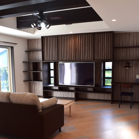 造作のテレビ台横に旦那様のパソコンスペースを設け、仕事をしながらでも家族との時間を共有できる、また奥様がキッチンに立っていても子供の様子がしっかり見れるLDKとなりました。