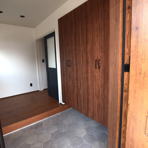 外観も内観もお施主様のこだわりが詰まった、お友達に自慢したくなる家。玄関ポーチを広くとってるため、カーポートと繋がっており、雨の日でも濡れることなく中に入れます。一歩中に入ると可愛いタイルとリビングへの入り口ドアがお出迎え。靴の収納もたっぷりです。
