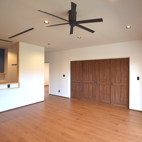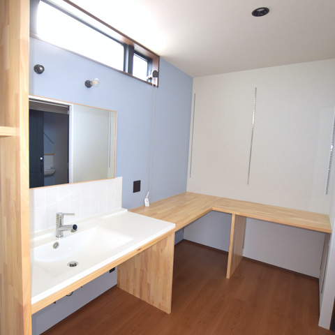 リビング、洗面はオシャレな奥様のこだわりたっぷり。本が好きなご家族なので広めの本棚収納スペースを設置、その隣には大容量のパントリーも。洗面は造作で。手洗い場の横に作業スペースを設け、洗濯物を畳んでそのまま棚に収納できるという家事動線になっています。